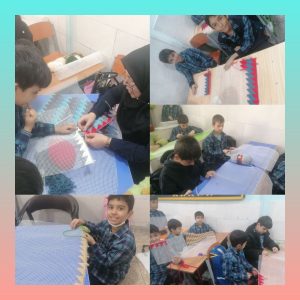 دوخت فرشینه در هفته ماها مدرسه آرمانی ، هنر آسمانی دانش آموزان پایه چهارم دبستان شهدای صنایع هواپیمایی مدیریت : خانم فاطمه مولایی مربی تربیتی : آقای تفرشی معاون پرورشی : محبوبه پیشیاره